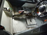 交換のためにはダッシュから後ろの内装、シート2脚外し、また、リフトアップが出来ないためタイヤで高さを稼いでの作業です。